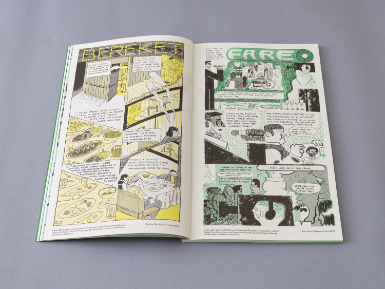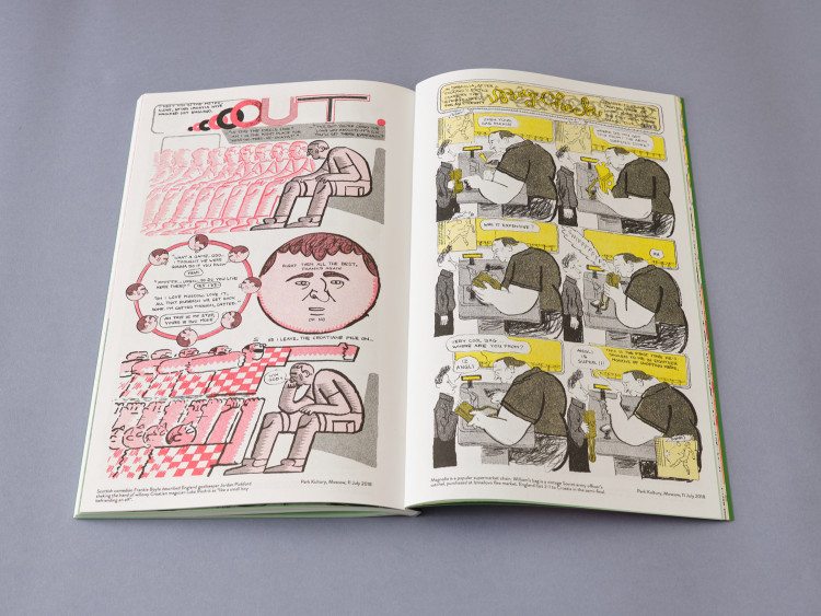 In collaboration with Christopher Rainbow and Sputnikat Press, ‘Russia 2018: A World Cup Journal’ is a collection of reportage comics, illustrations and essays, made in Russia during its World Cup summer of 2018. Through a series of observational snapshots, ‘A World Cup Journal’ examines the friendships, cultural idiosyncrasies, and shared love of football between visitors and locals during that summer, documenting a period of short-lived optimism while also tracing the portents of darker days ahead.
